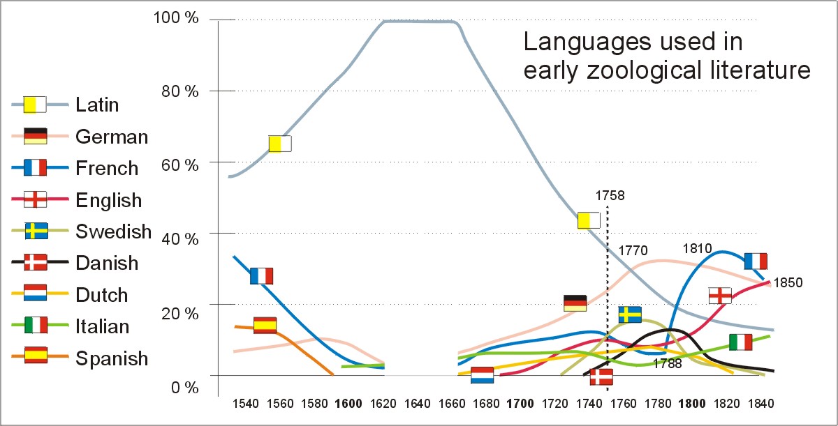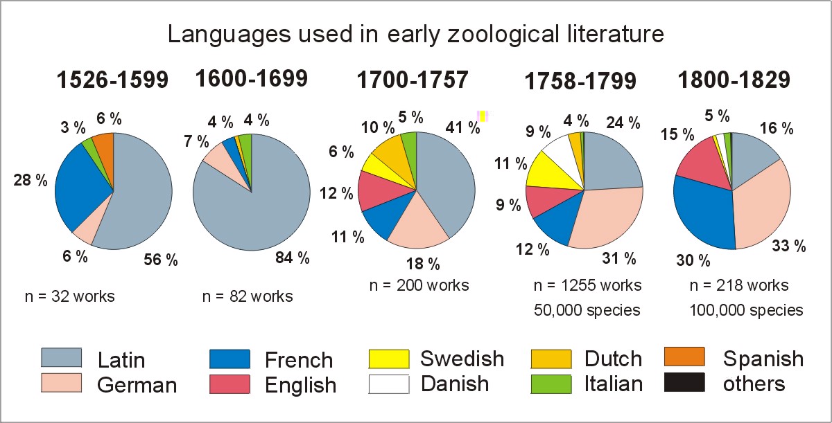 Importance of languages in early zoology, based on evaluations of paper titles by decade.