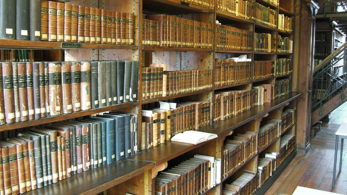 Natural History section in the historical library, showing the basic works of Linnaeus (the open book on the shelf is Linnaeus 1758, Systema Naturae 10the edition, the zoological part).