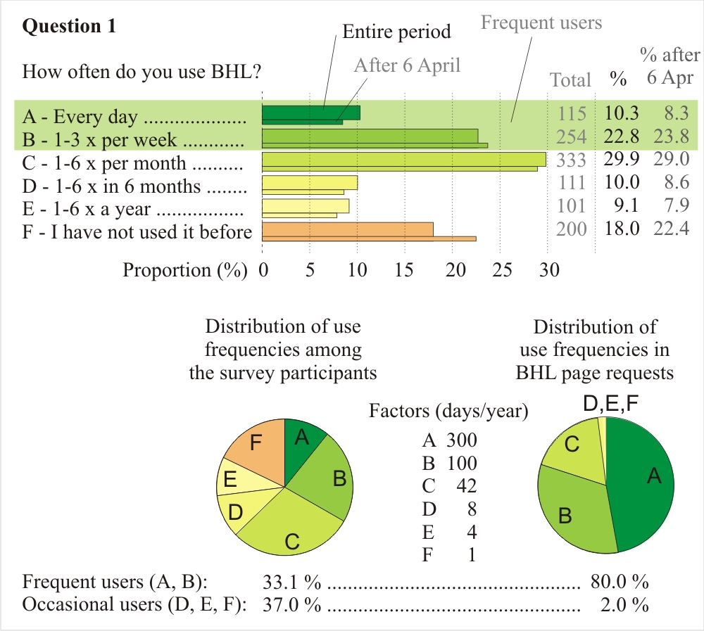 Most participants of the survey used BHL less than 2 times in a week. This group accounts for approximately 20 % of the page requests at BHL.