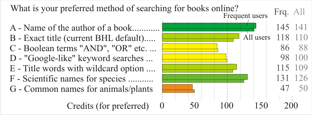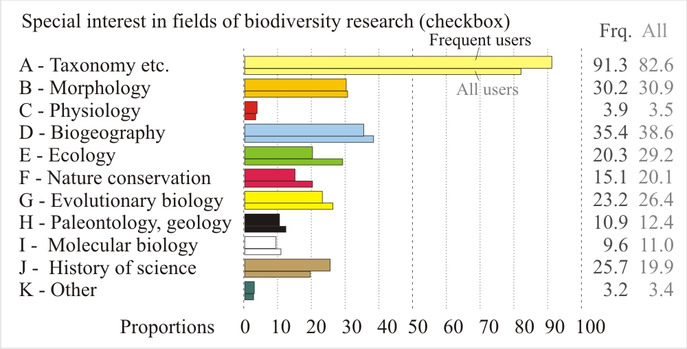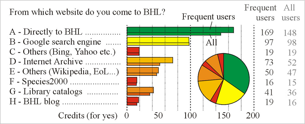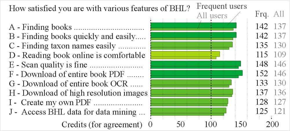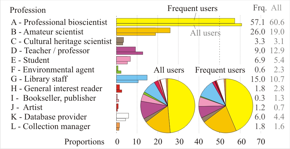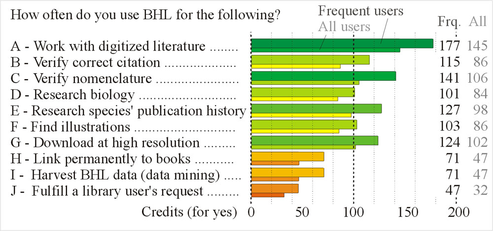 BHL is mostly used for veryfying nomenclatural questions (141 credits in frequent users, a very high value), less frequently for researching the publication history of species and for verifying the correct citations of literature sources. BHL is substantially less frequently used to find illustrations, and even less for researches on the biology behind the taxonomic name.