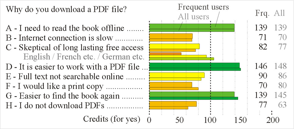 Bullet points H (stable URLs), I (data mining) and J (library requests) addressed particular interest groups, who responded more positively to the points than average (the "all users" value for database providers in bullet point H was 64). The low rates of affirmation does not mean that the service was not requested. It means that the service is only requested by particular target user groups.