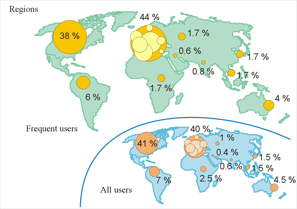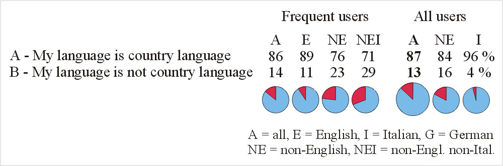 15 % frequent users), French (7 and 9 %), Spanish (5 and 6 %), Italian (5 %),