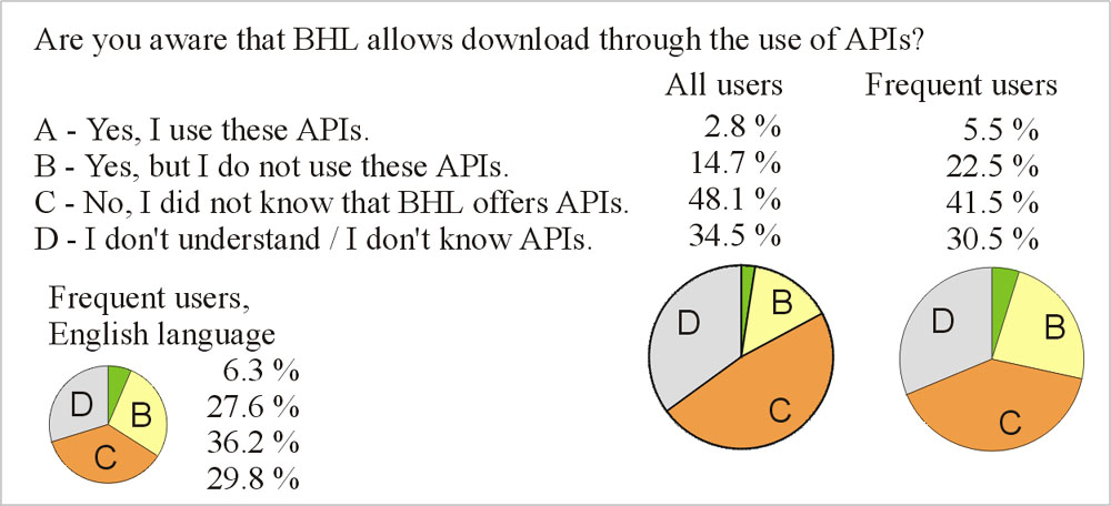 1/3 of the participants were frequent users, the others occasional users or had not used BHL before. The "frequent users" group (A and B) constituted by far the most important section among the participants in terms of usage.
