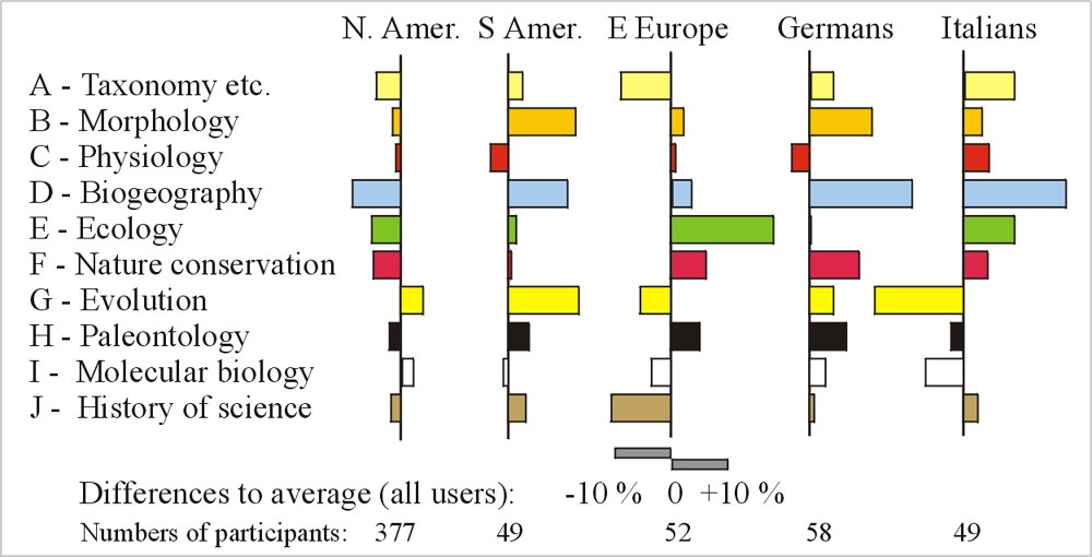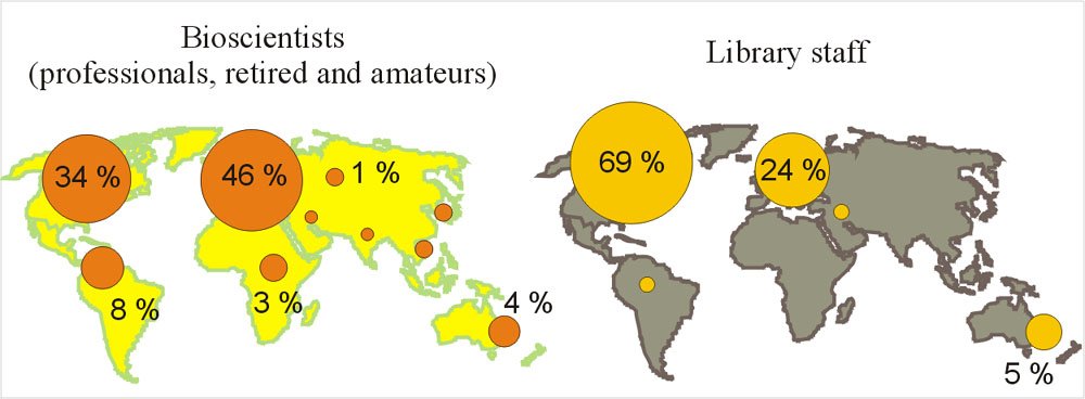 Librarians came mostly from North America, some from Europe and Australia, while bioscientists came from various different regions, many from Europe, one-third from North America, also many from South America.