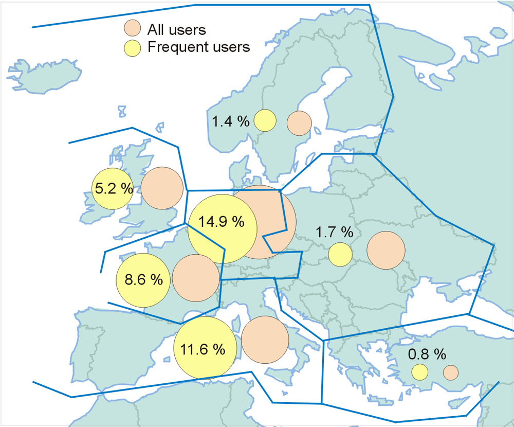 There were only weak differences among frequent and occasional users.